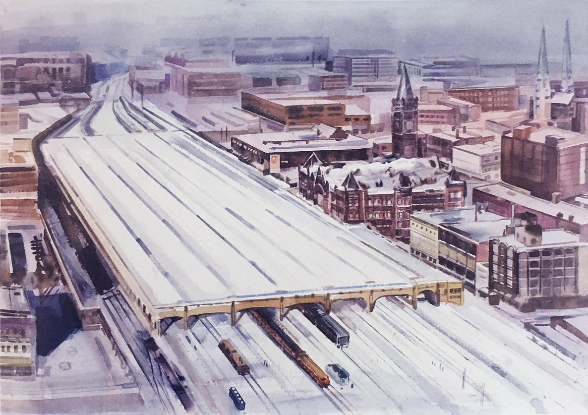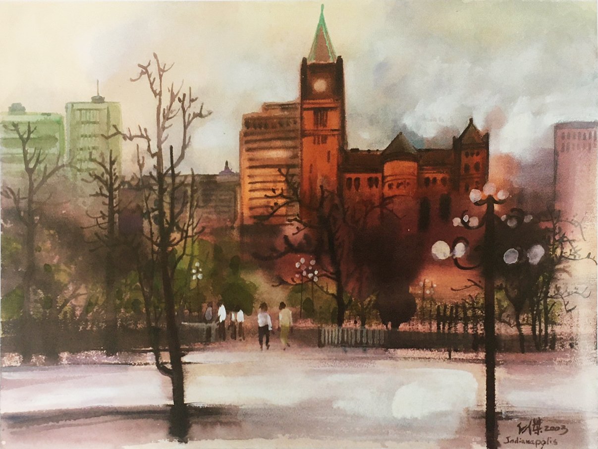 A043 林仁傑---積雪覆蓋下的印第安納波里斯聯合車站 水彩 80x114cm 2019